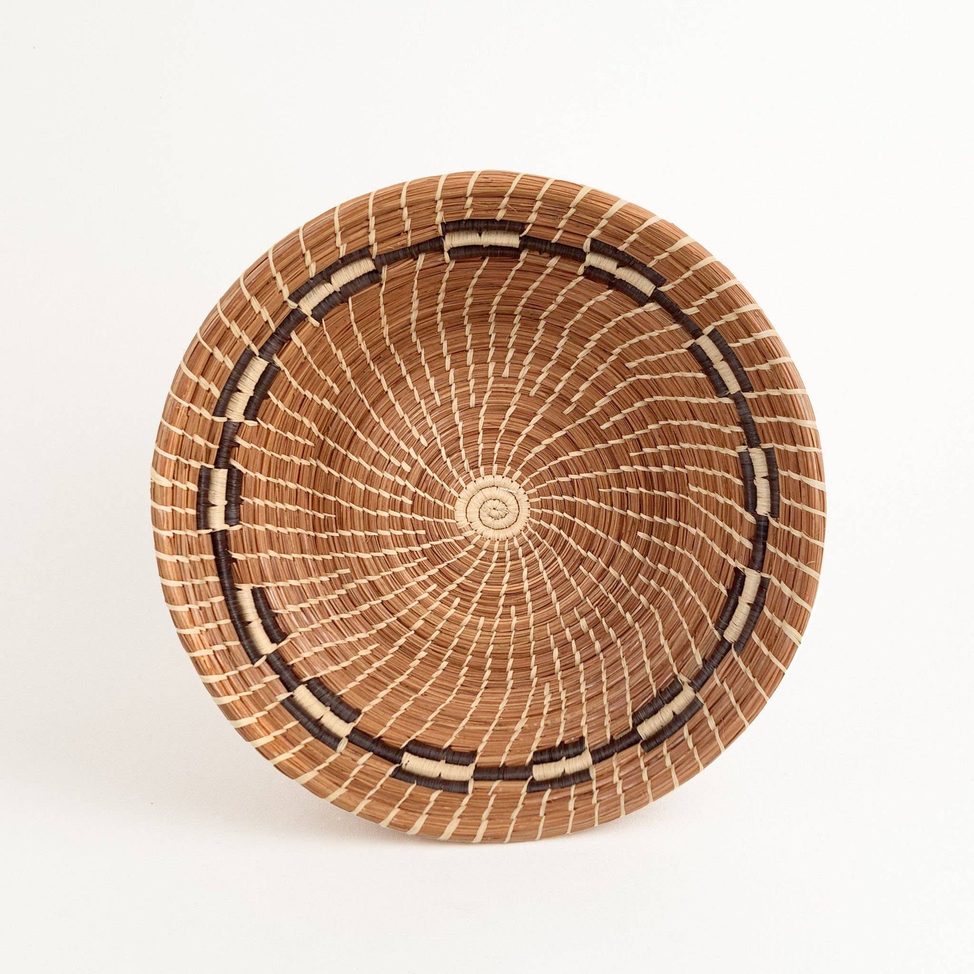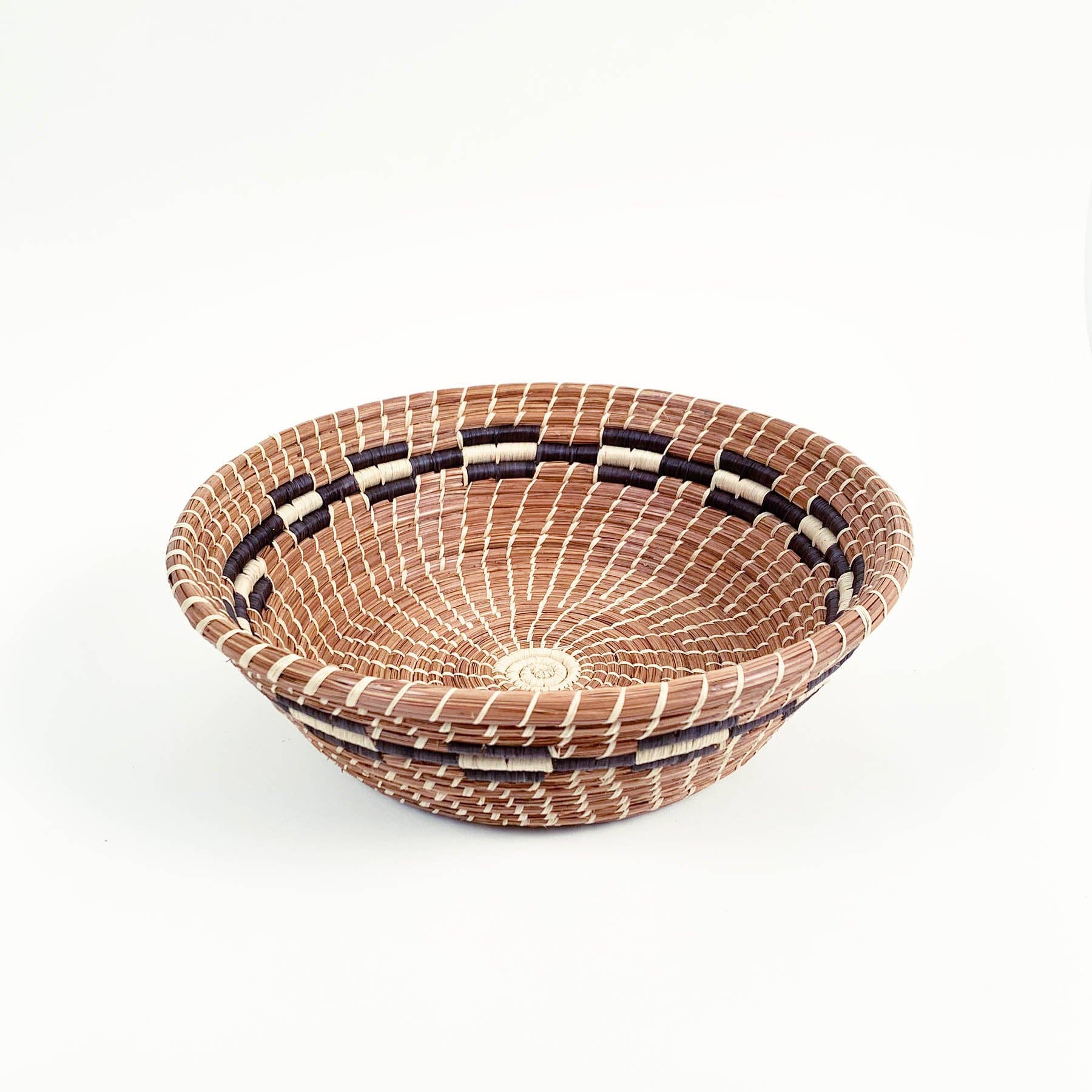 Perfect as a table centerpiece, bread or fruit bowl, or desktop organizer. Intricate raffia stitching on coils of sustainably harvested pine needles. Gently sloping sides feature a two-tone band of alternating light and dark raffia that accent the warm natural color of the pine needles.