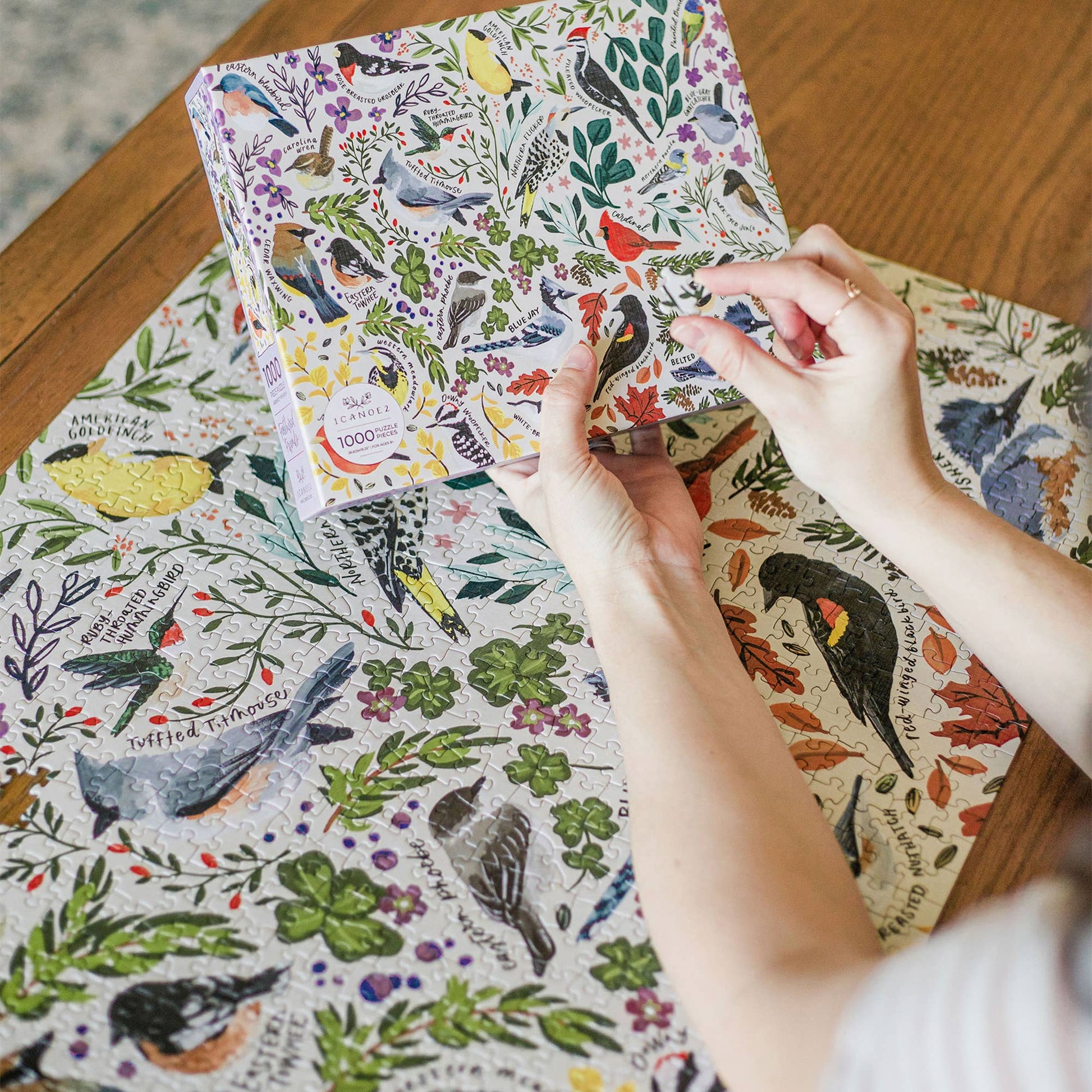 Our birds puzzle makes the perfect gift for Mother's Day and Father's Day or for any bird watcher or nature lover. It features a variety of beautifully hand-painted birds such as the blue jay, goldfinch, cardinal, chickadee, eastern bluebird (our state bird!), hummingbird, wren, a few woodpeckers, and more! Each species' name is hand-lettered, making this puzzle a fun and educational activity for kids and adults.