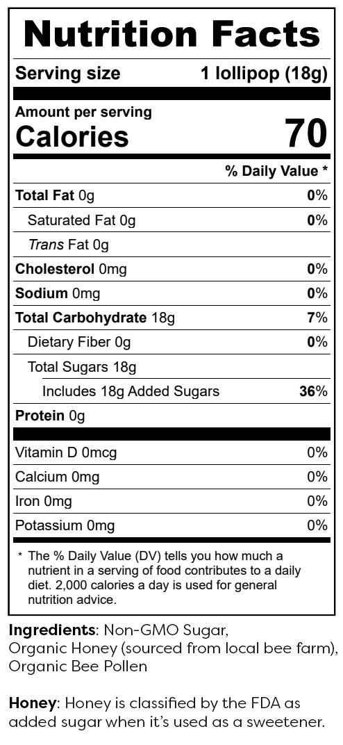 • California Wildflower Honey: Known for its allergy-alleviating properties, our wildflower honey adds a deliciously unique flavor to each lollipop.