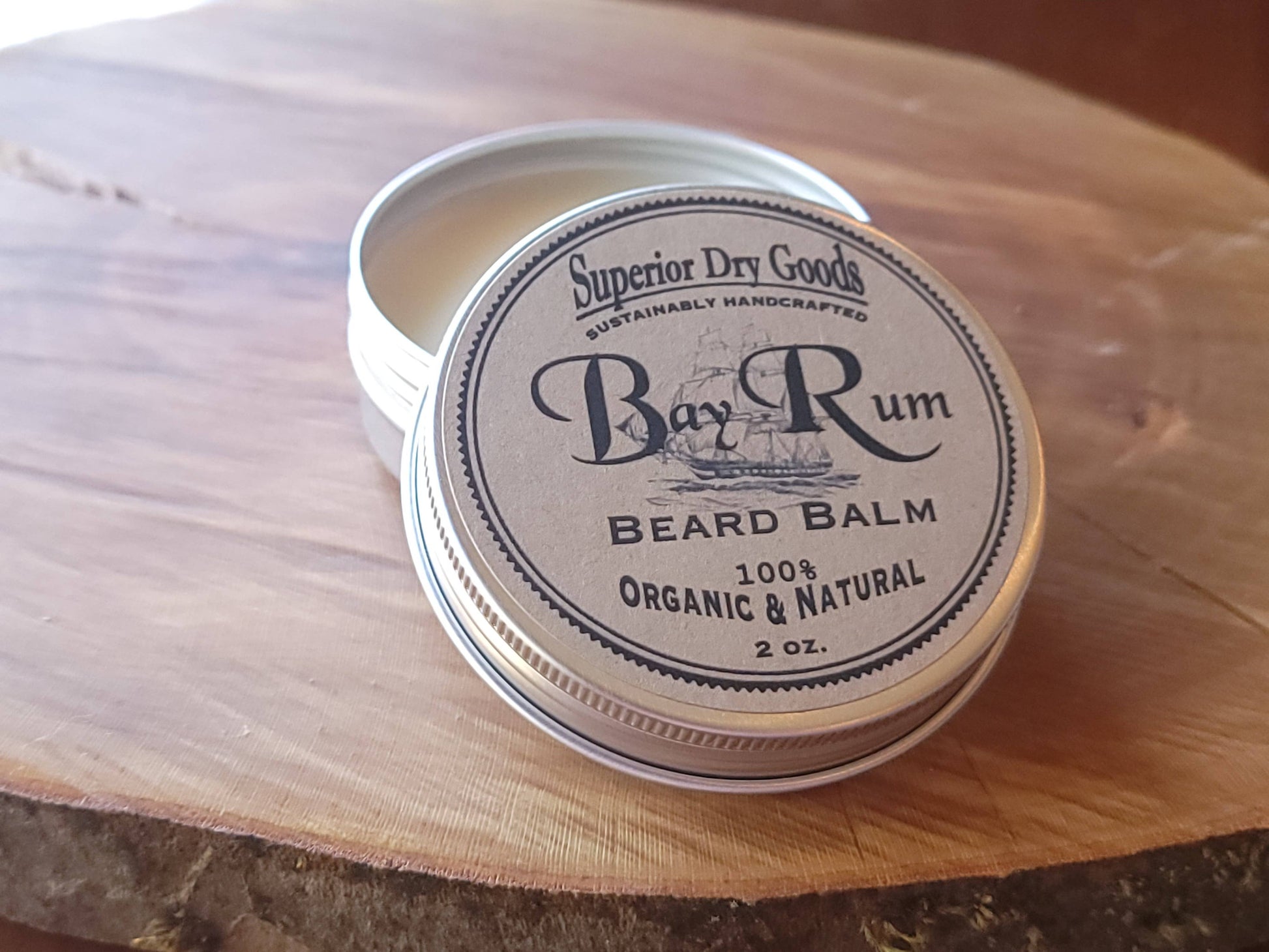 100% natural and organic Bay Rum beard balm in 2 oz aluminum tin. Premium ingredients include genuine essential oils, USA organic beeswax, organic mango butter, and organic shea butter.