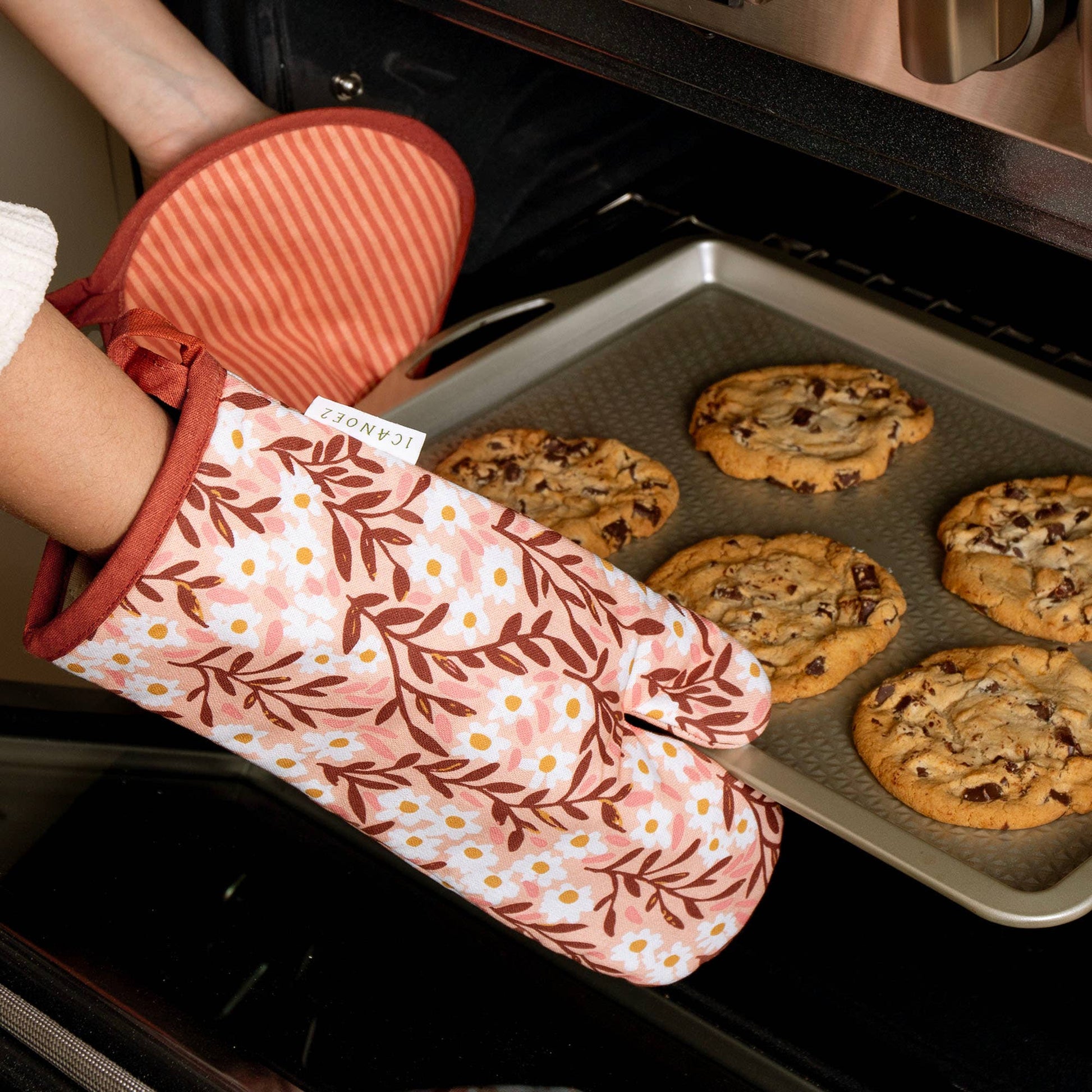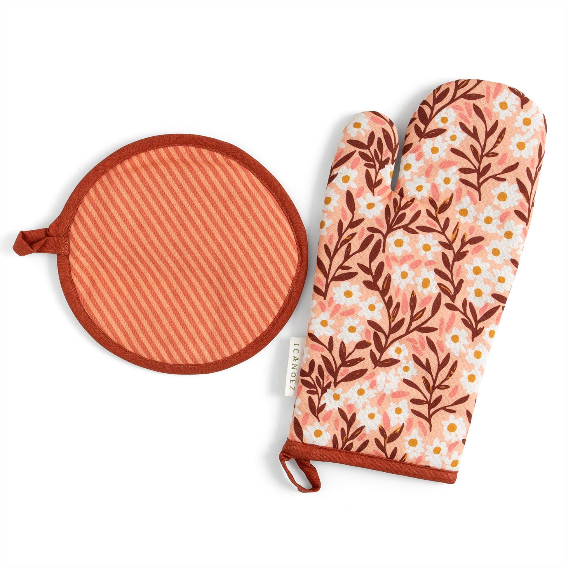 Bring charming florals to your kitchen with our Pink Daisy Pot Holder Set. This coordinating oven mitt and pot hodler duo showcase hand-drawn daisy designs. Stylish and practical, it's the perfect addition to your cooking essentials. Keep it for yourself or gift to a flower-loving friend!