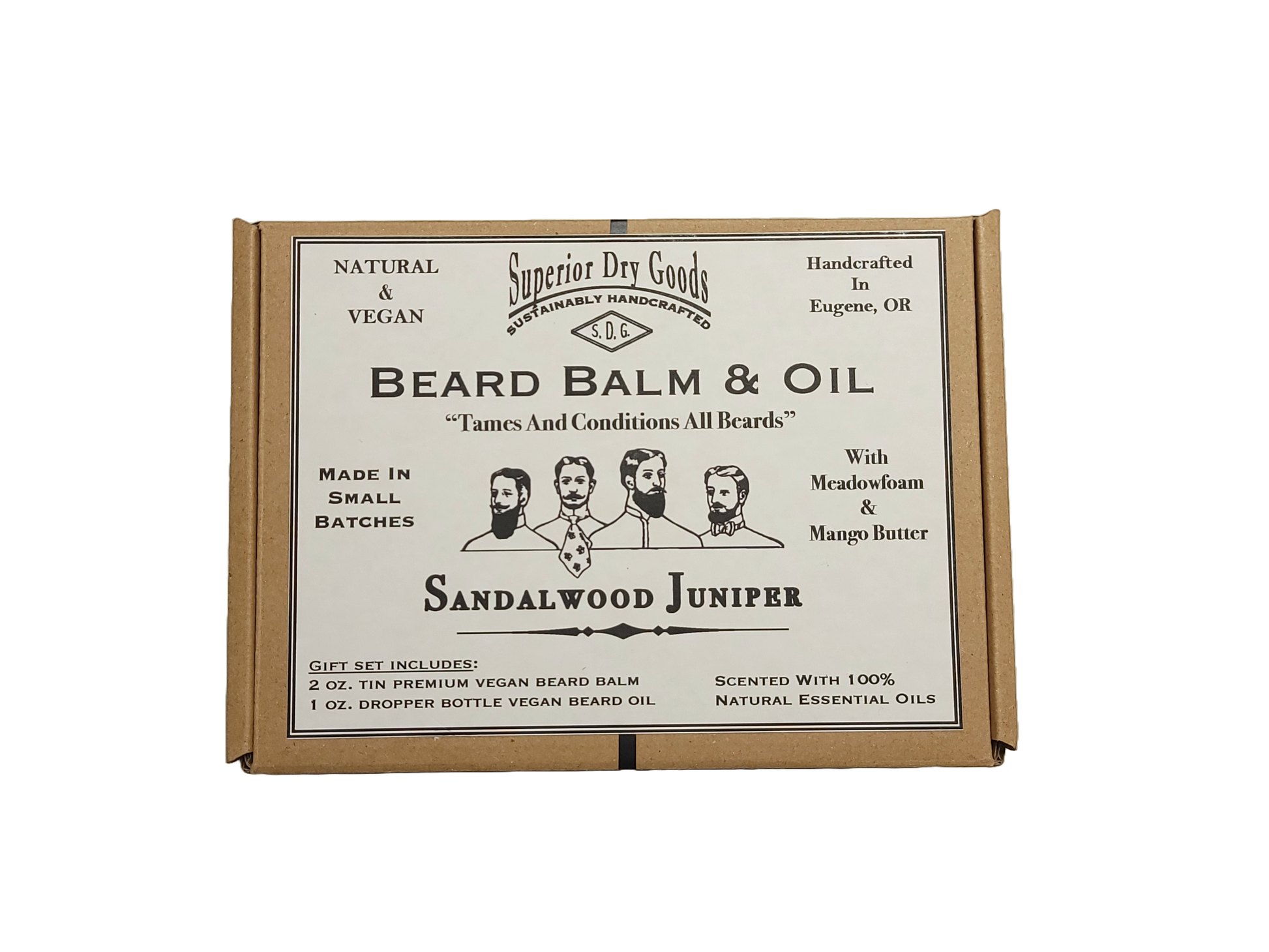 This premium Sandalwood Juniper handcrafted beard gift set includes 1 oz. of beard oil in a dropper bottle and 2 oz. of beard balm in an aluminum tin. The items are presented in a recycled kraft box with crinkle filler. Each product is in its own recycled box. Beard balms also include a bamboo scoop.