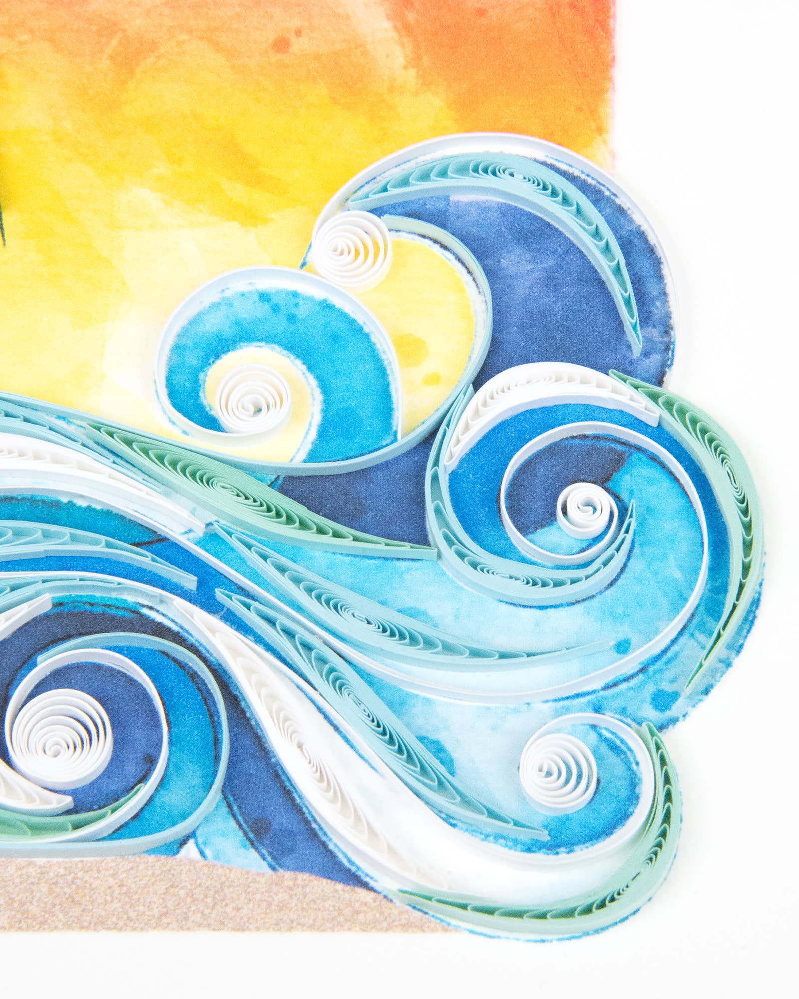 Surf’s up! Let your loved one know you are thinking of them with the Quilled Surfing Paradise card. The artwork features a red and white surfboard leaning against a palm tree on a beach, blue waves, and a red and yellow sky in the background.